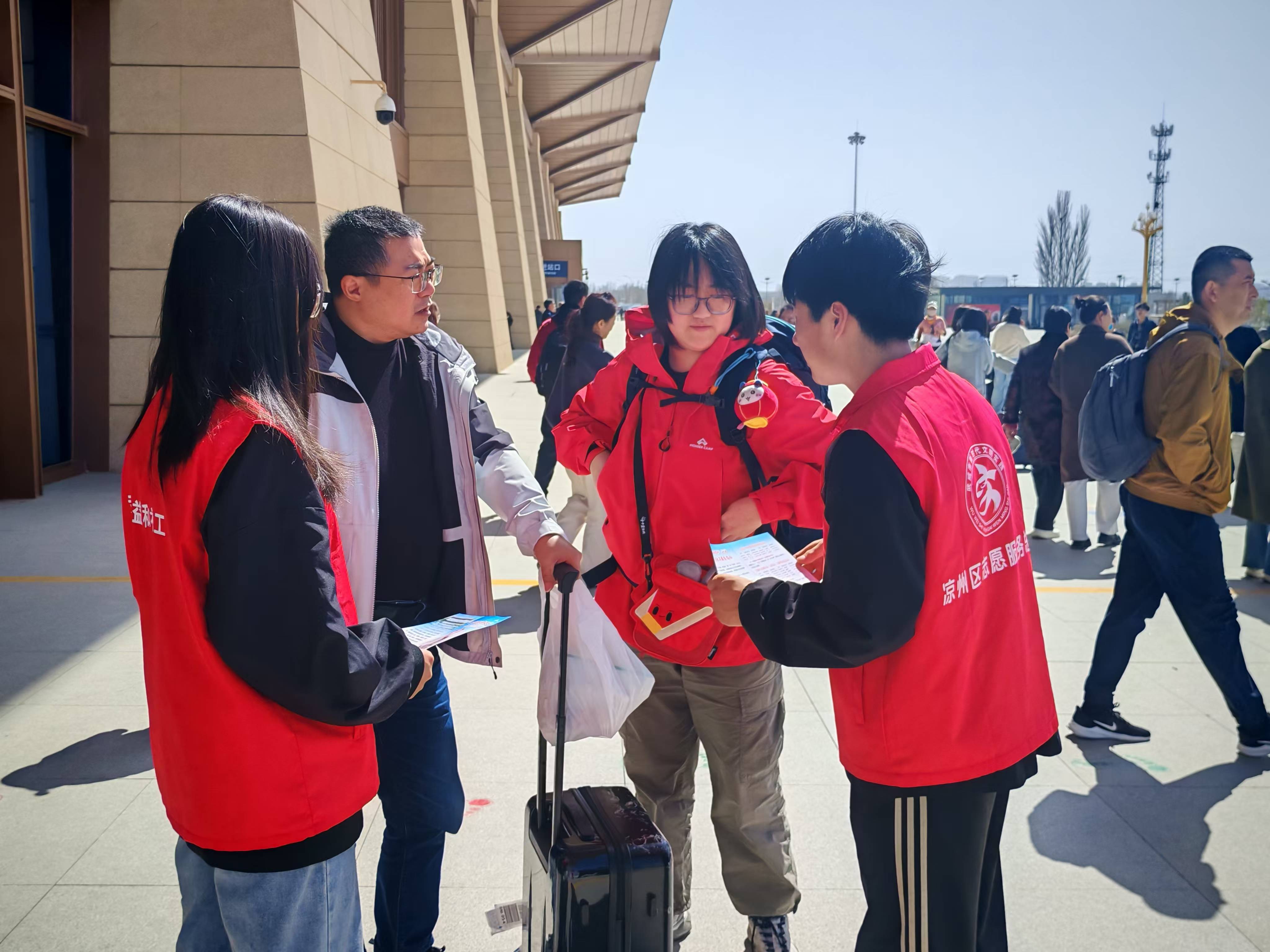 在志愿服務(wù)站點(diǎn),志愿者們身穿紅馬甲,化身“沙漠綠洲向?qū)А?,?gòu)成一道暖心風(fēng)景線。他們熱情地為遠(yuǎn)道而來的全國各地植樹志愿者們提供暖心引導(dǎo),熱情細(xì)致告知前往民勤的乘車路線、換乘信息和注意事項(xiàng),并協(xié)助搬運(yùn)行李,引導(dǎo)植樹志愿者們有序乘車,用實(shí)際行動詮釋了新時代青年的責(zé)任與擔(dān)當(dāng)。