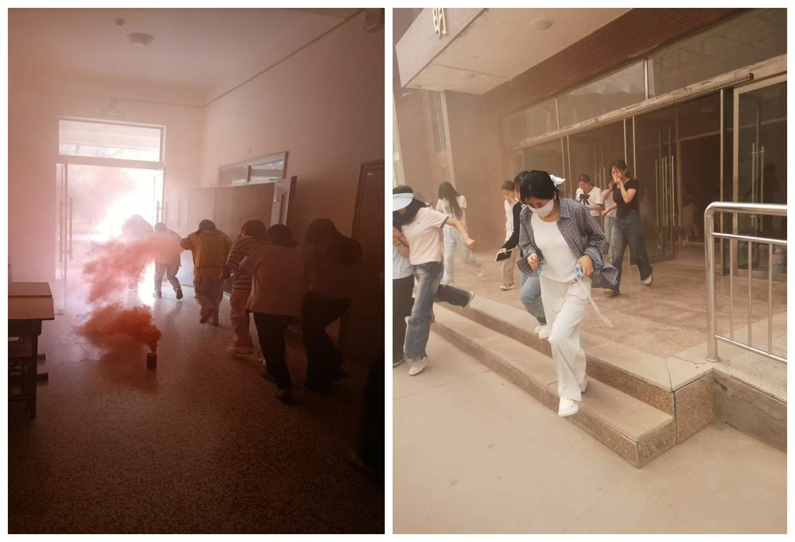 下午4點30分,隨著警報響起,演練正式拉開帷幕。安保人員迅速點燃預(yù)先放置在各樓宇內(nèi)的煙霧彈,一瞬間樓宇內(nèi)濃煙彌漫,同學們迅速捂住口鼻、彎腰低姿從消防疏散通道,有序地向安全區(qū)域疏散撤離。演練過程中,同學們沉著冷靜,動作迅速規(guī)范,僅用短短幾分鐘時間便全部安全疏散到校園廣場等開闊地帶。