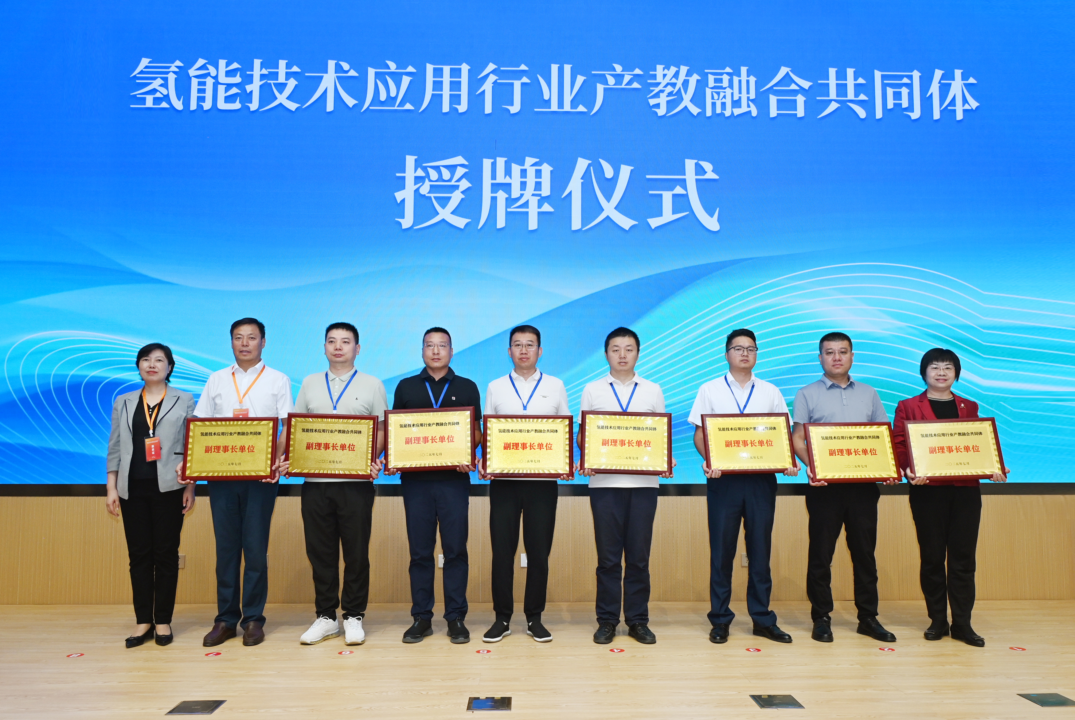 啟動儀式上,與會領(lǐng)導(dǎo)共同點亮啟動球,宣布氫能技術(shù)應(yīng)用行業(yè)產(chǎn)教融合共同體正式成立。大會公布了共同體理事會成員單位名單,并為理事長單位、副理事長單位授牌。