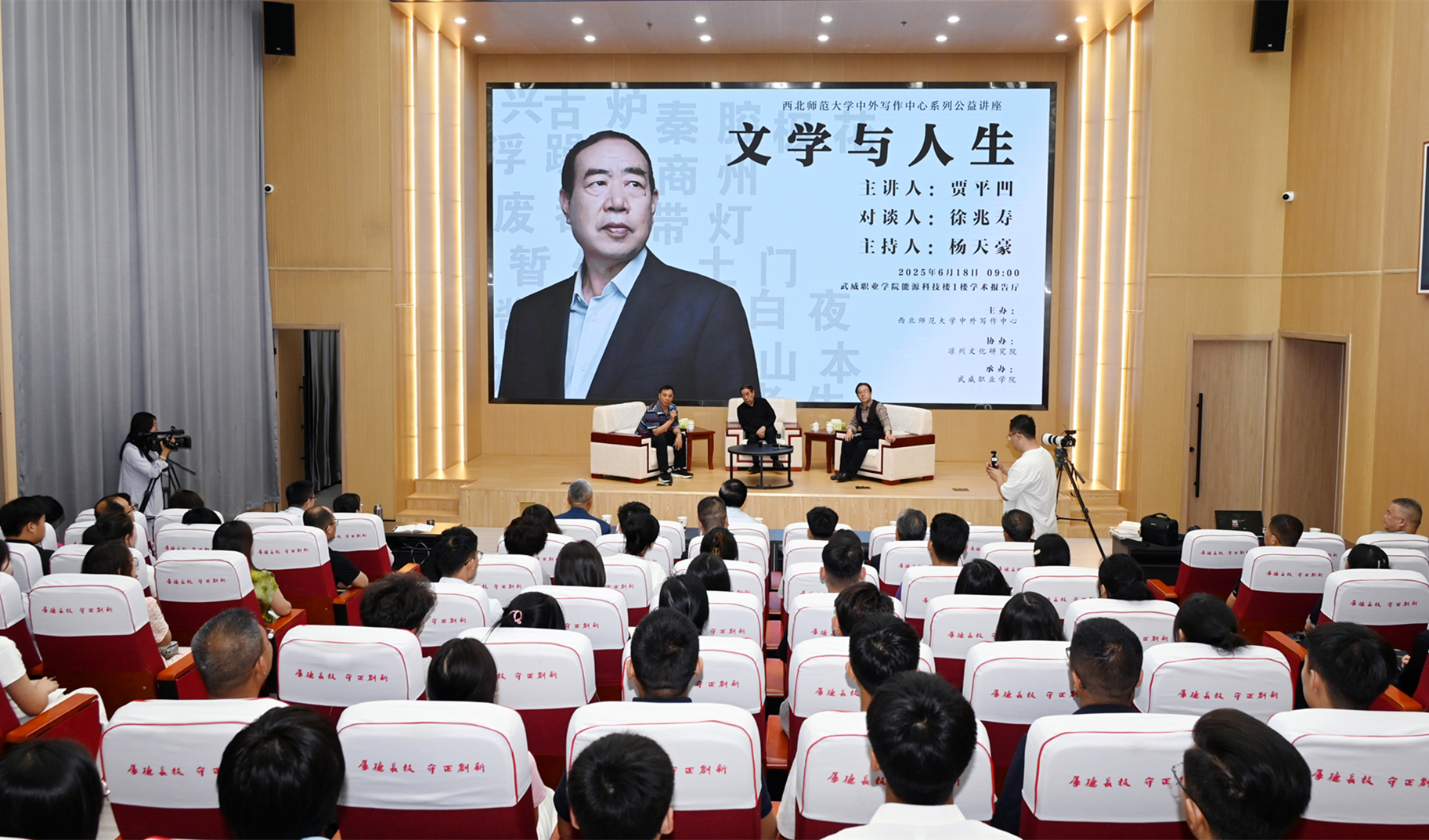 近日,西北師范大學(xué)中外寫作中心武威基地“文學(xué)與人生”公益講座在武威職業(yè)技術(shù)大學(xué)舉辦。著名作家、西北師范大學(xué)特聘教授賈平凹擔(dān)任主講嘉賓,寫作中心常務(wù)副主任徐兆壽教授擔(dān)任對(duì)談嘉賓,與師生共赴一場(chǎng)思想文化盛宴。講座由西北師范大學(xué)中外寫作中心副主任楊天豪主持。