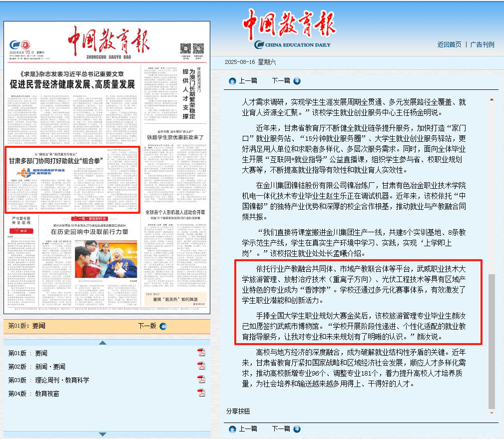 8月16日,《中國(guó)教育報(bào)》要聞版刊發(fā)“從‘促就業(yè)’到‘高質(zhì)量充分就業(yè)’甘肅多部門協(xié)同打好助就業(yè)‘組合拳’”的專題報(bào)道,報(bào)道了我校深化產(chǎn)教融合,賦能高質(zhì)量充分就業(yè)的創(chuàng)新實(shí)踐案例。
