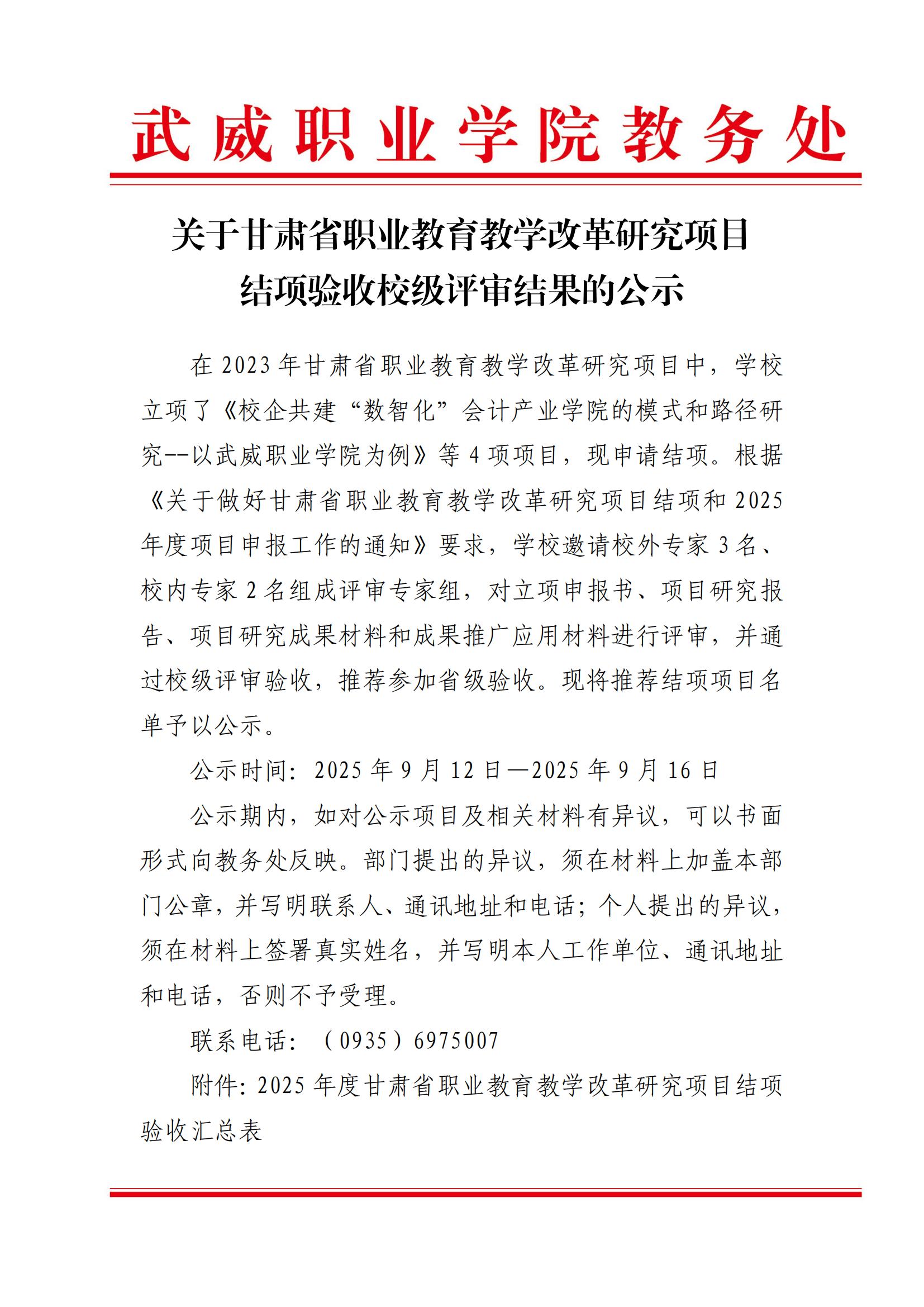 關(guān)于甘肅省職業(yè)教育教學(xué)改革研究項(xiàng)目結(jié)項(xiàng)驗(yàn)收校級(jí)評(píng)審結(jié)果的公示