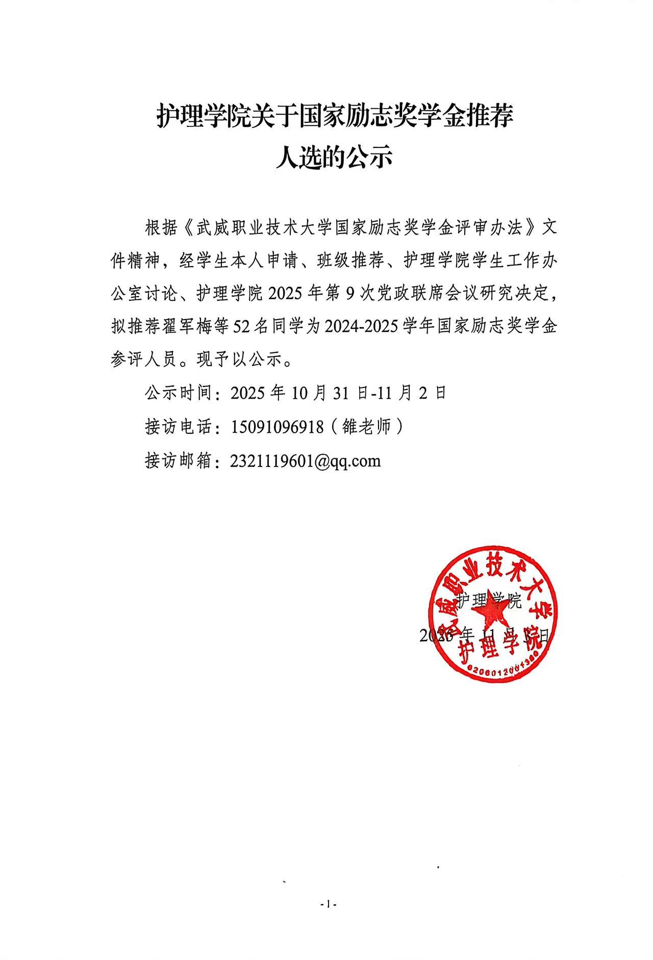 護(hù)理學(xué)院關(guān)于國家勵志獎學(xué)金推薦人選的公示