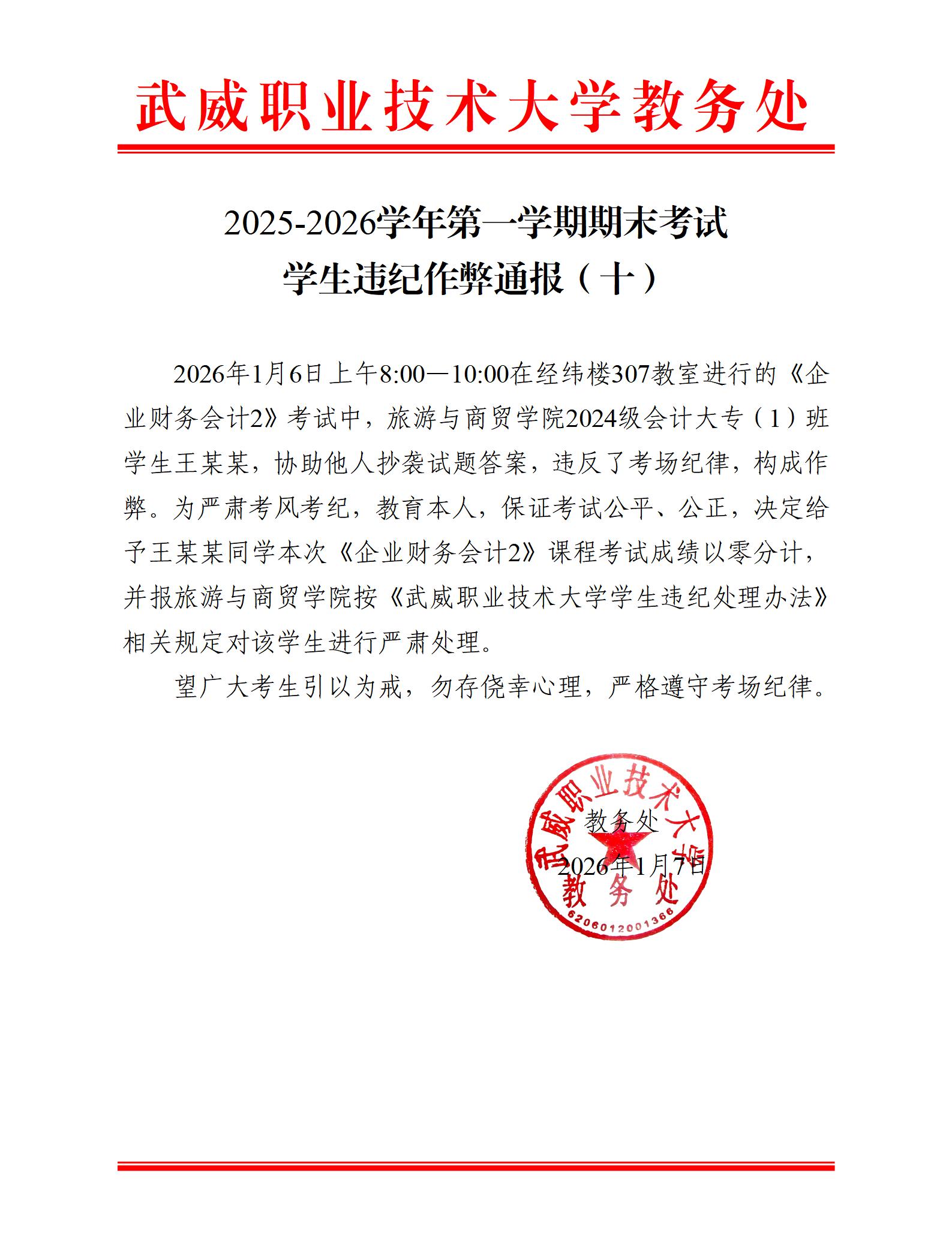 2025-2026學年第一學期期末考試學生違紀作弊通報(十)