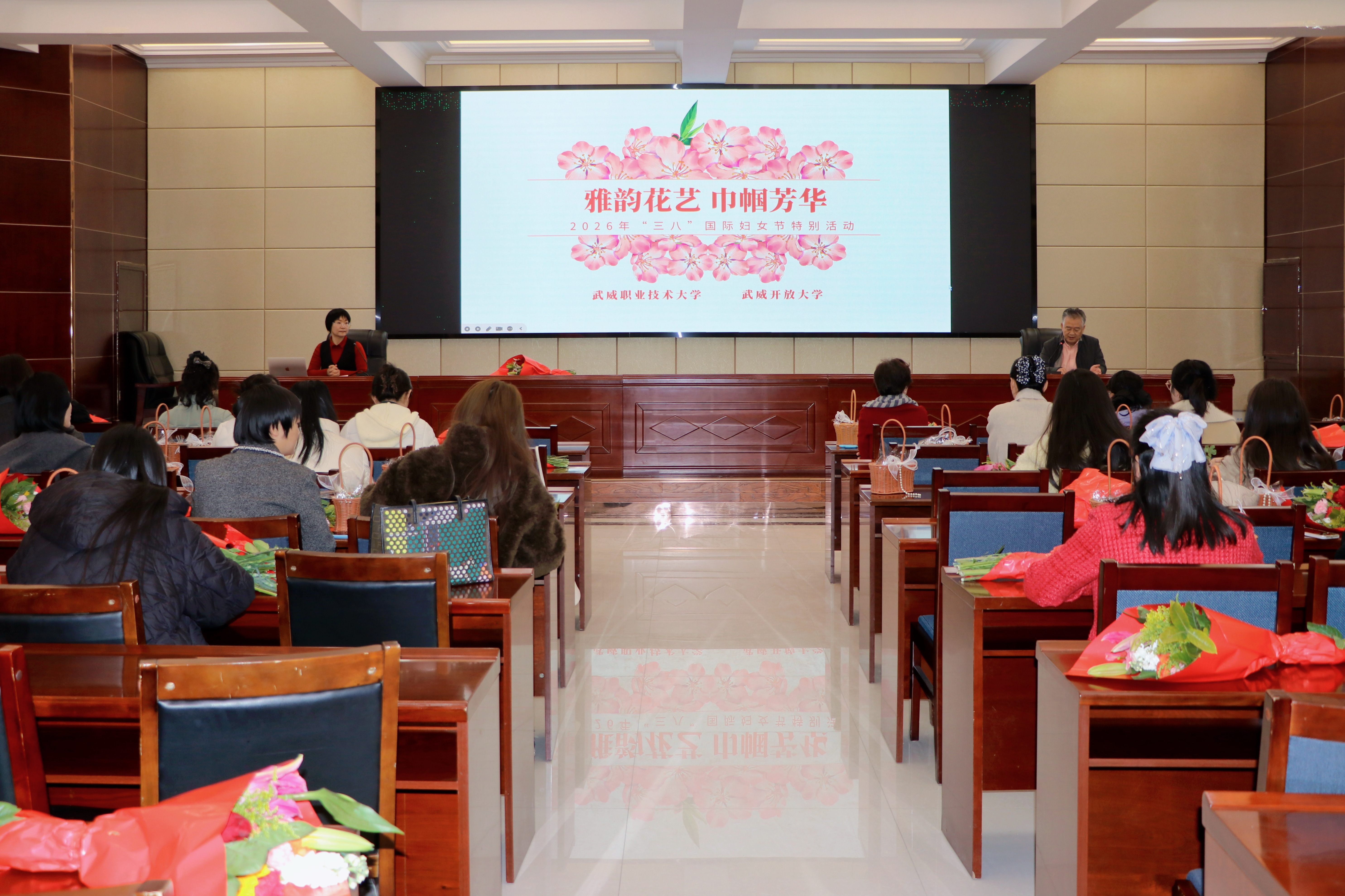 為慶祝第116個“三八”國際勞動婦女節(jié),3月6日,學(xué)校工會聯(lián)合武威開放大學(xué),在行樹樓北側(cè)報告廳組織開展了以“雅韻花藝?巾幗芳華”為主題的插花活動,130余名女教職工歡聚一堂、共赴花約。黨委委員、副校長何毅出席活動并致辭。
