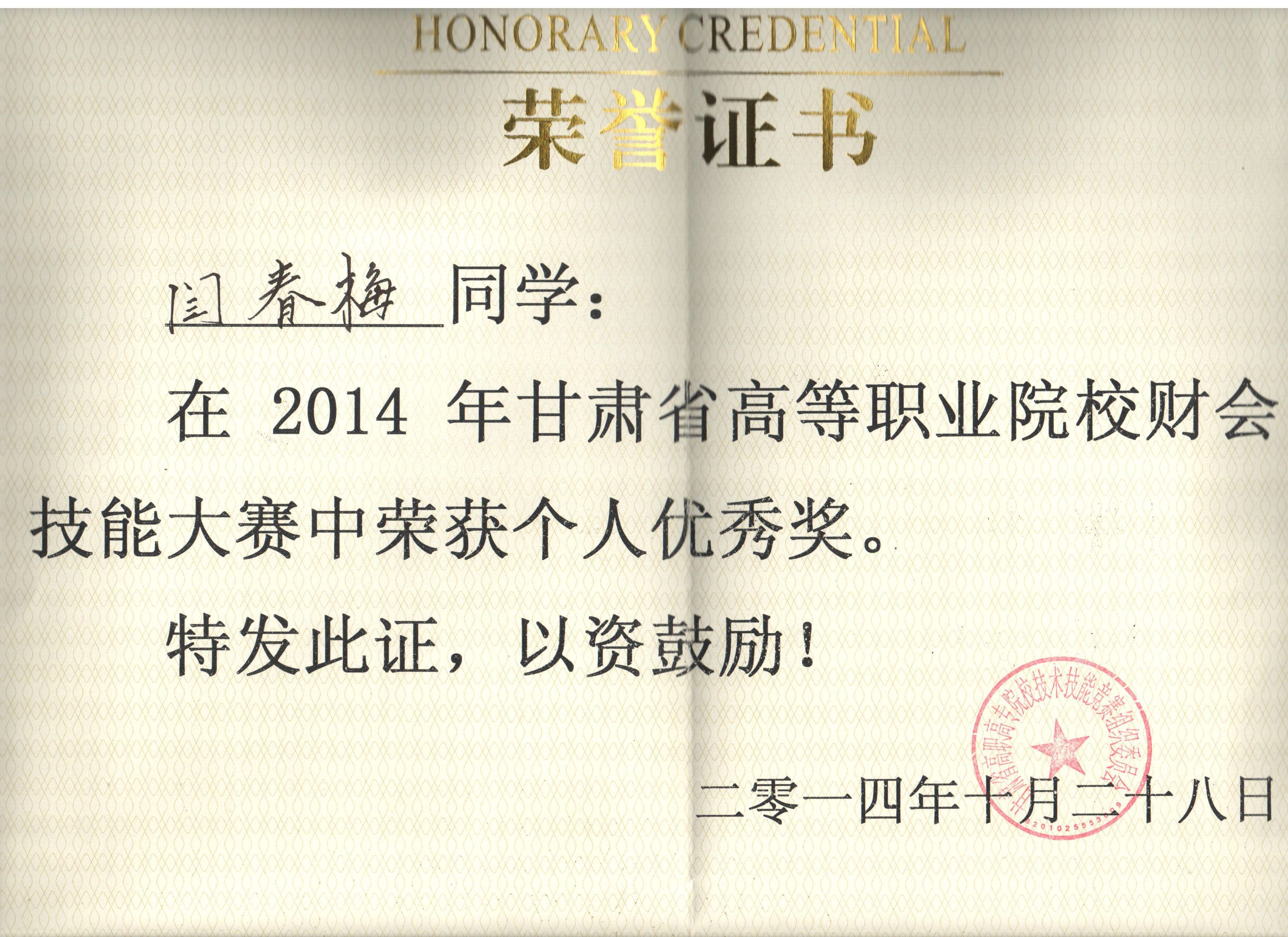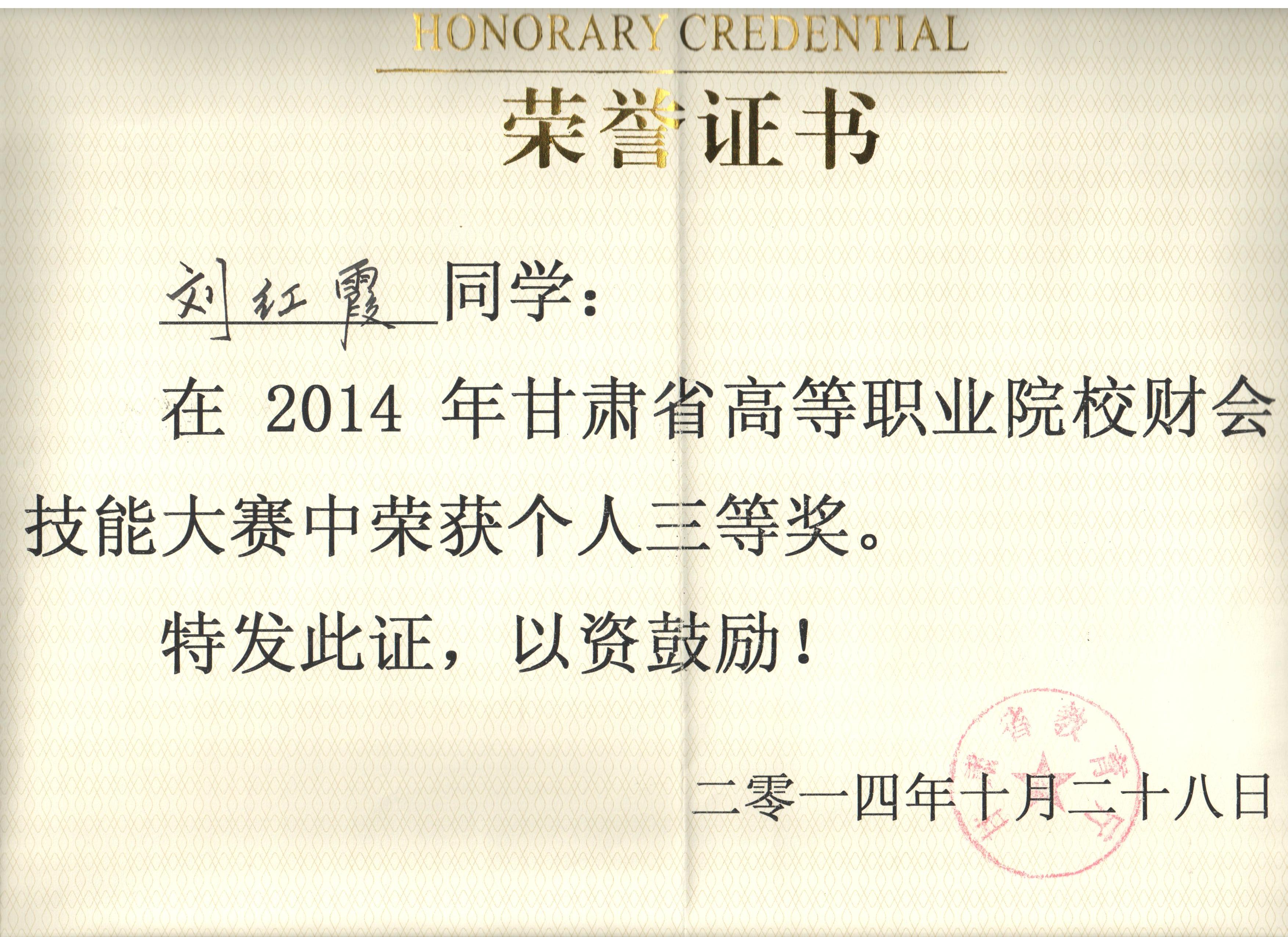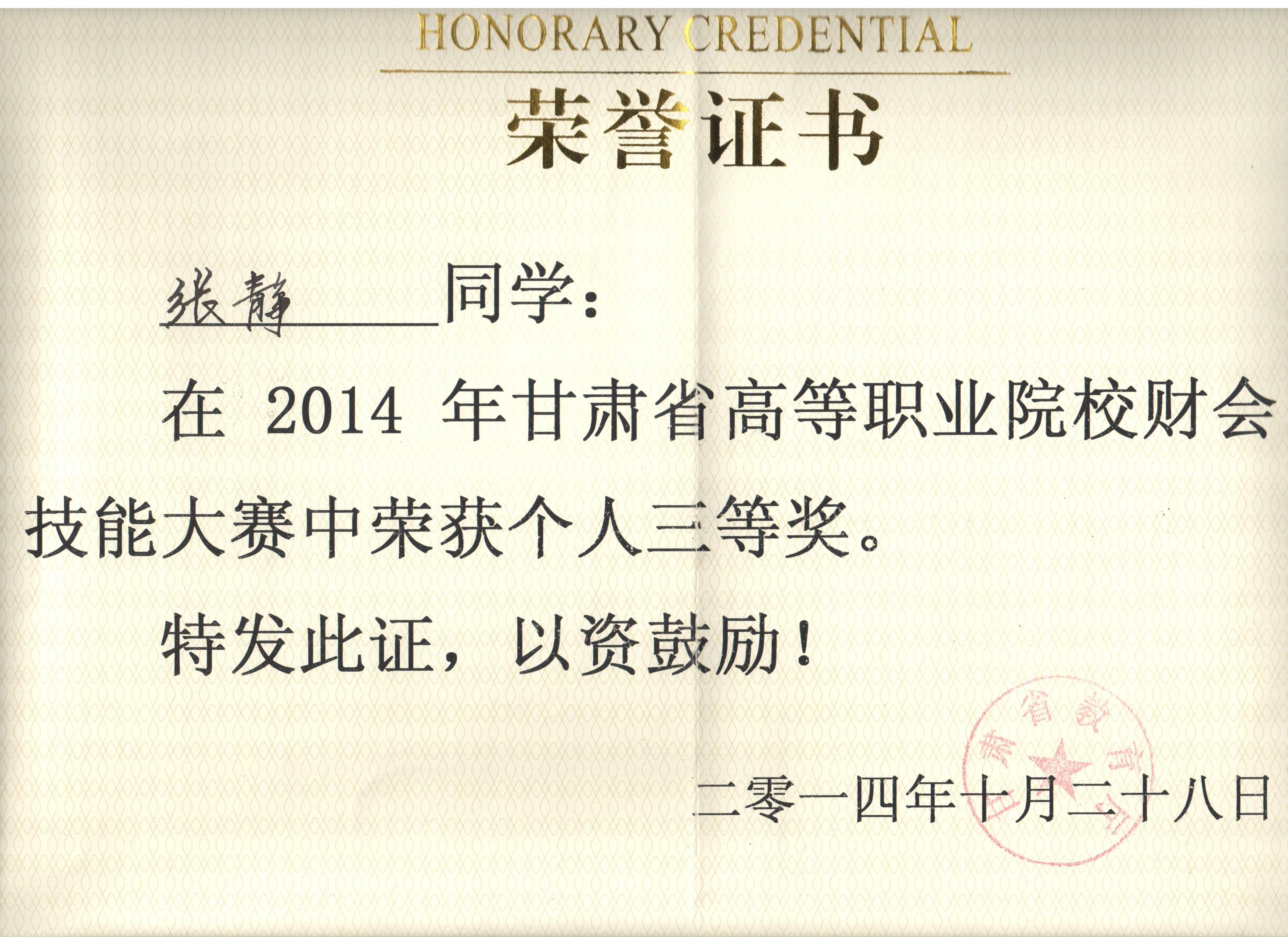 經(jīng)濟(jì)管理系李惠蘭、賀德赟老師指導(dǎo)我系會(huì)計(jì)專(zhuān)業(yè)學(xué)生參加2014年甘肅省高等職業(yè)學(xué)院財(cái)會(huì)技能大賽,榮獲優(yōu)秀獎(jiǎng)。