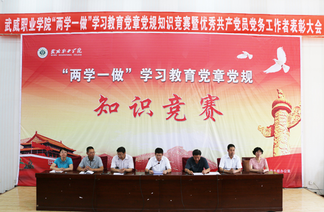 7月6日下午,武威職業(yè)學(xué)院“兩學(xué)一做”學(xué)習(xí)教育黨章黨規(guī)知識(shí)競(jìng)賽暨優(yōu)秀共產(chǎn)黨員、優(yōu)秀黨務(wù)工作者表彰大會(huì)在尚德樓正德廳召開(kāi)。黨委書記張國(guó)民,黨委副書記趙明,紀(jì)委書記張富國(guó),副院長(zhǎng)翟存祥、王永緒、潘玉華、田迎春出席會(huì)議。直屬附屬醫(yī)院黨委主要負(fù)責(zé)同志、各黨總支(直屬黨支部)書記,各部門負(fù)責(zé)人,受表彰的優(yōu)秀共產(chǎn)黨員、優(yōu)秀黨務(wù)工作者以及參加競(jìng)賽的代表隊(duì)成員共270人參加了知識(shí)競(jìng)賽活動(dòng)和表彰大會(huì)。表彰大會(huì)由黨委副書記趙明主持。