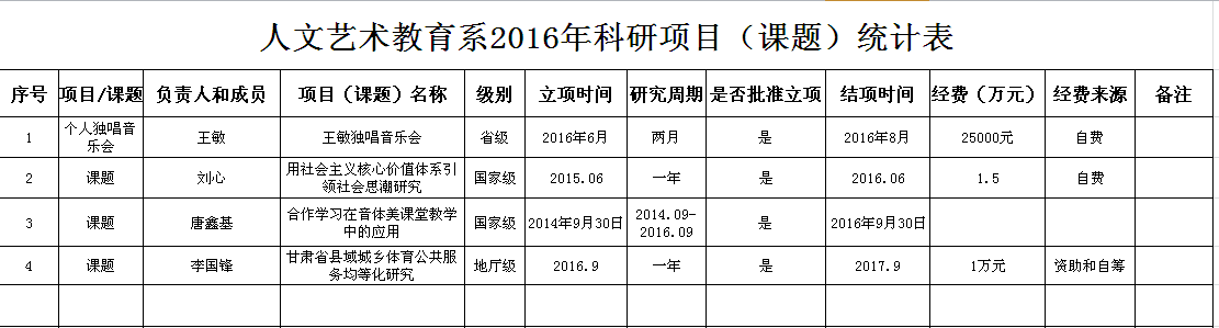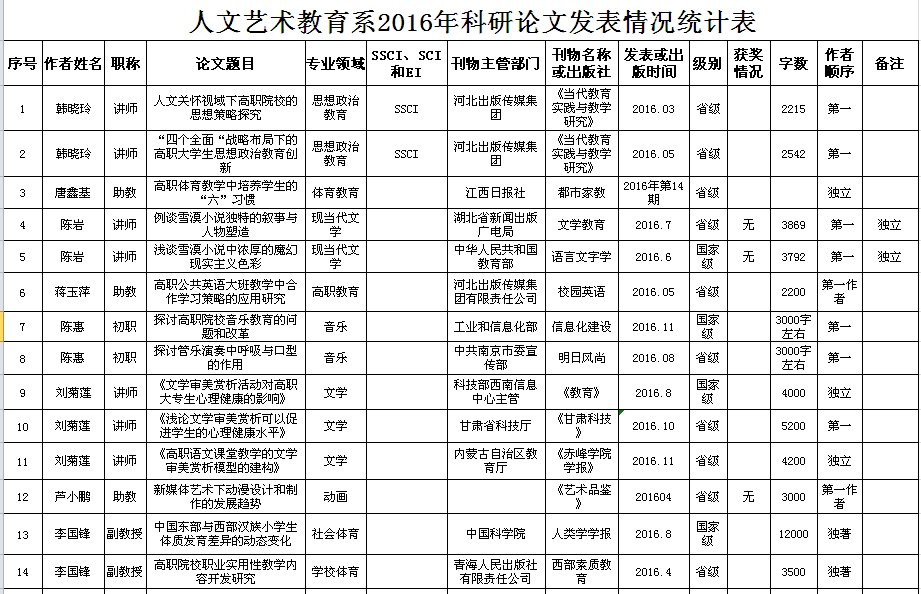 人文藝術教育系2016年科研成果統(tǒng)計