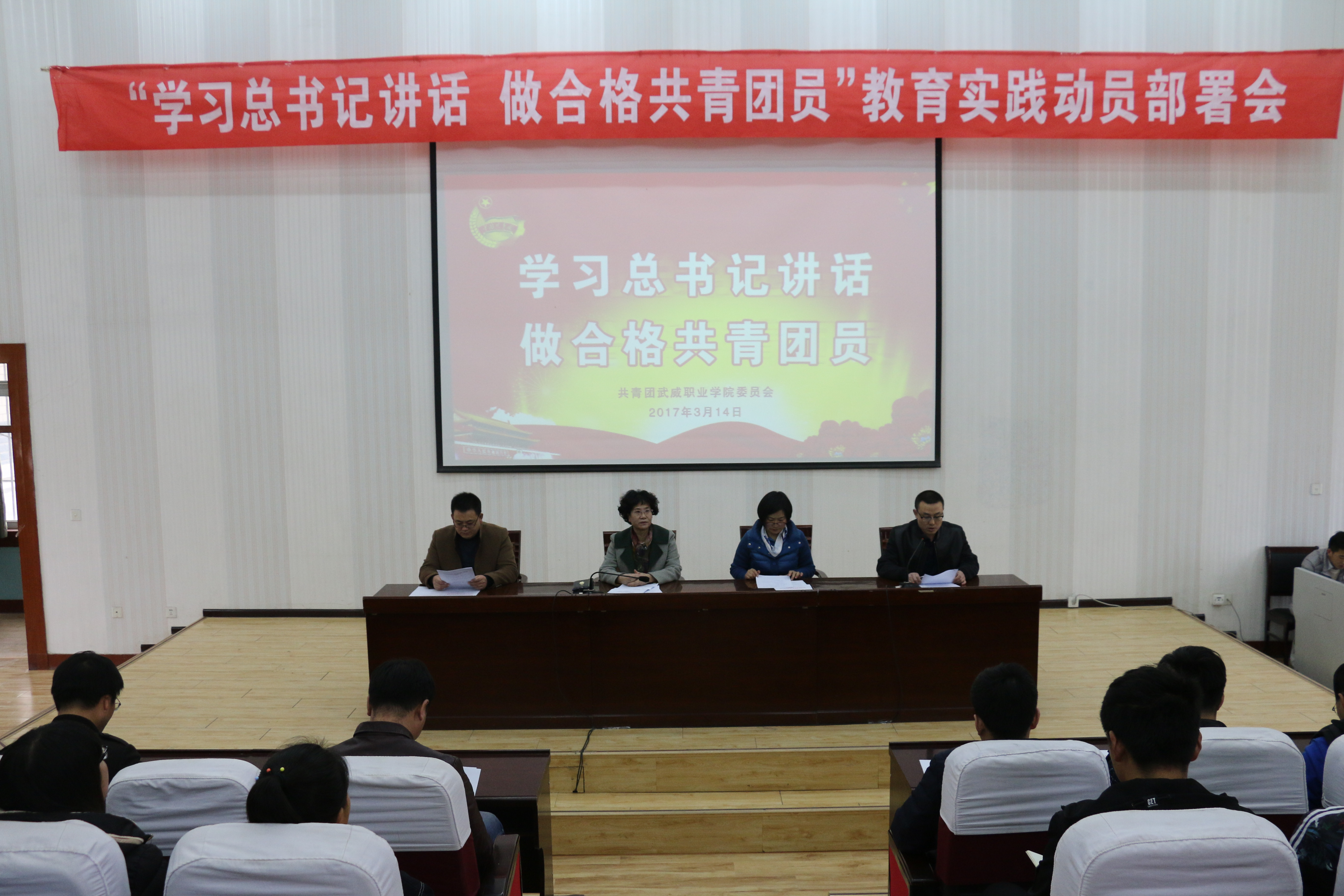 會(huì)議傳達(dá)了《共青團(tuán)武威職業(yè)學(xué)院委員會(huì)2017年工作要點(diǎn)》、《關(guān)于學(xué)院共青團(tuán)開展“學(xué)習(xí)總書記講話 做合格共青團(tuán)員”教育實(shí)踐的通知》,并對(duì)“一學(xué)一做”教育實(shí)踐作了安排部署。