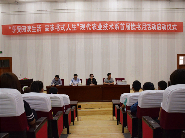 為營造“書香系部”,現(xiàn)代農(nóng)業(yè)技術(shù)系舉辦首屆讀書月活動,并于5月19日在尚德樓正徳廳舉行了“享受閱讀生活,品味書式人生”讀書月活動啟動儀式。我系全體專兼職教師,設(shè)施農(nóng)業(yè)技術(shù)、綠色食品生產(chǎn)與檢測、種子生產(chǎn)與經(jīng)營3個(gè)專業(yè)近300名學(xué)生參加了本次活動。