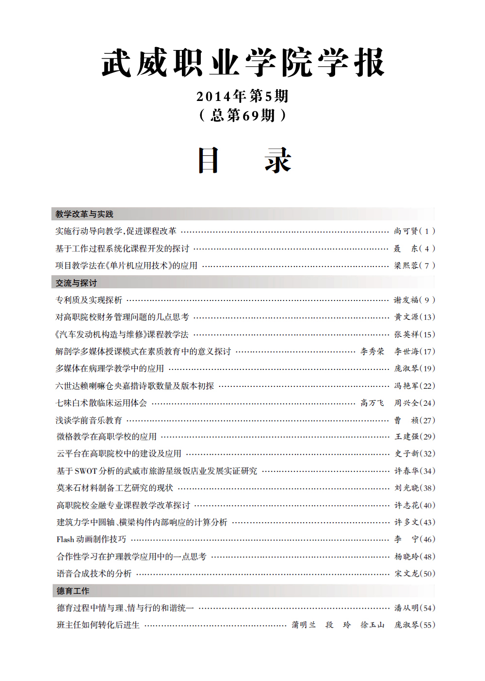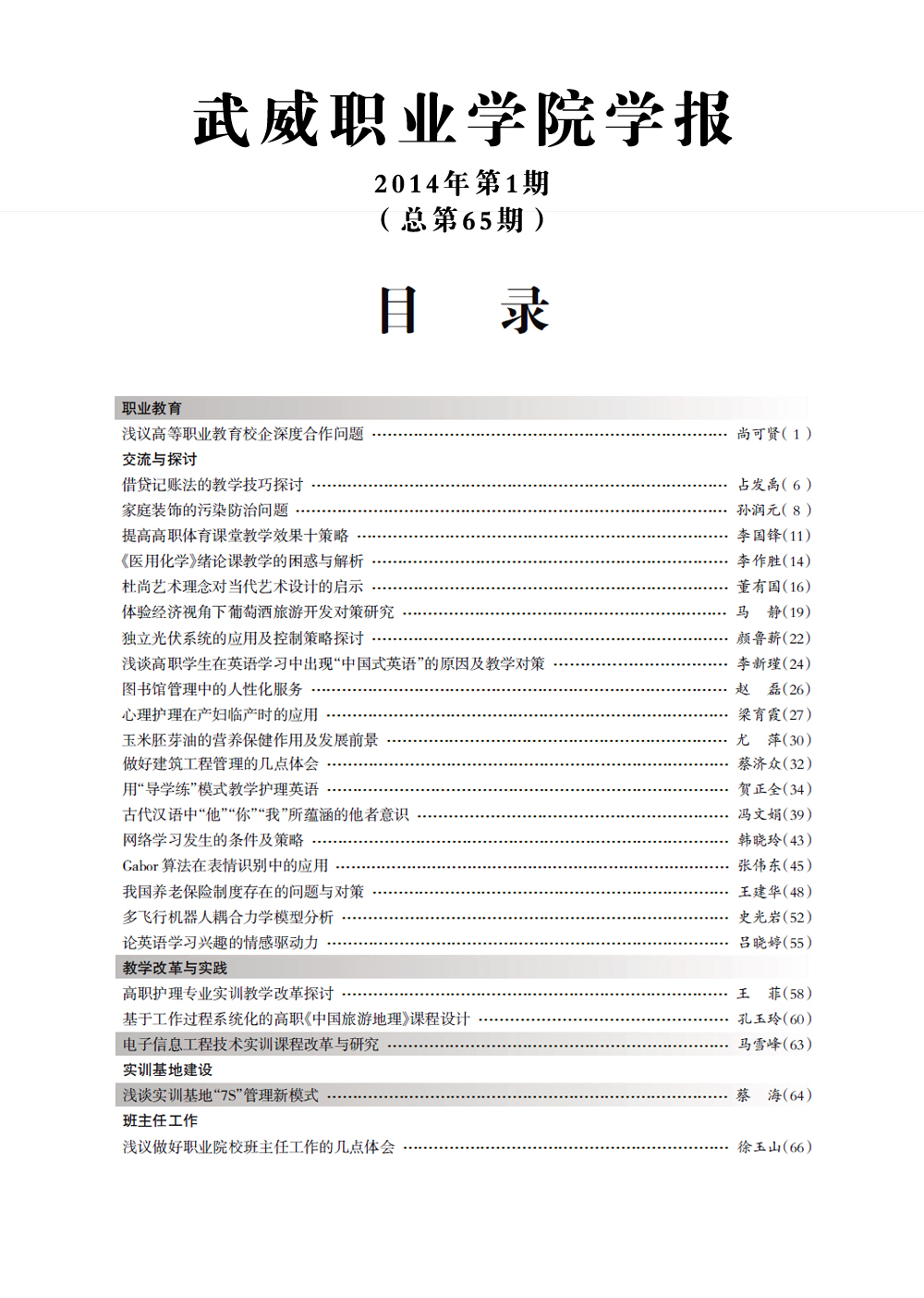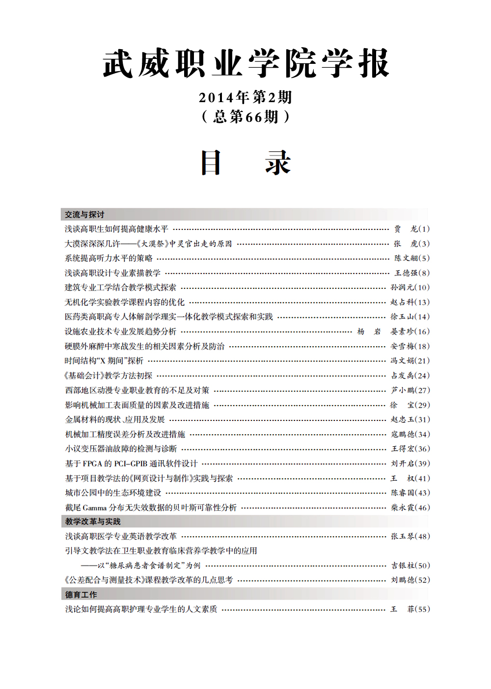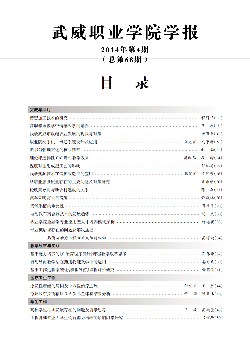 2014年《武威職業(yè)學(xué)院學(xué)報》目錄