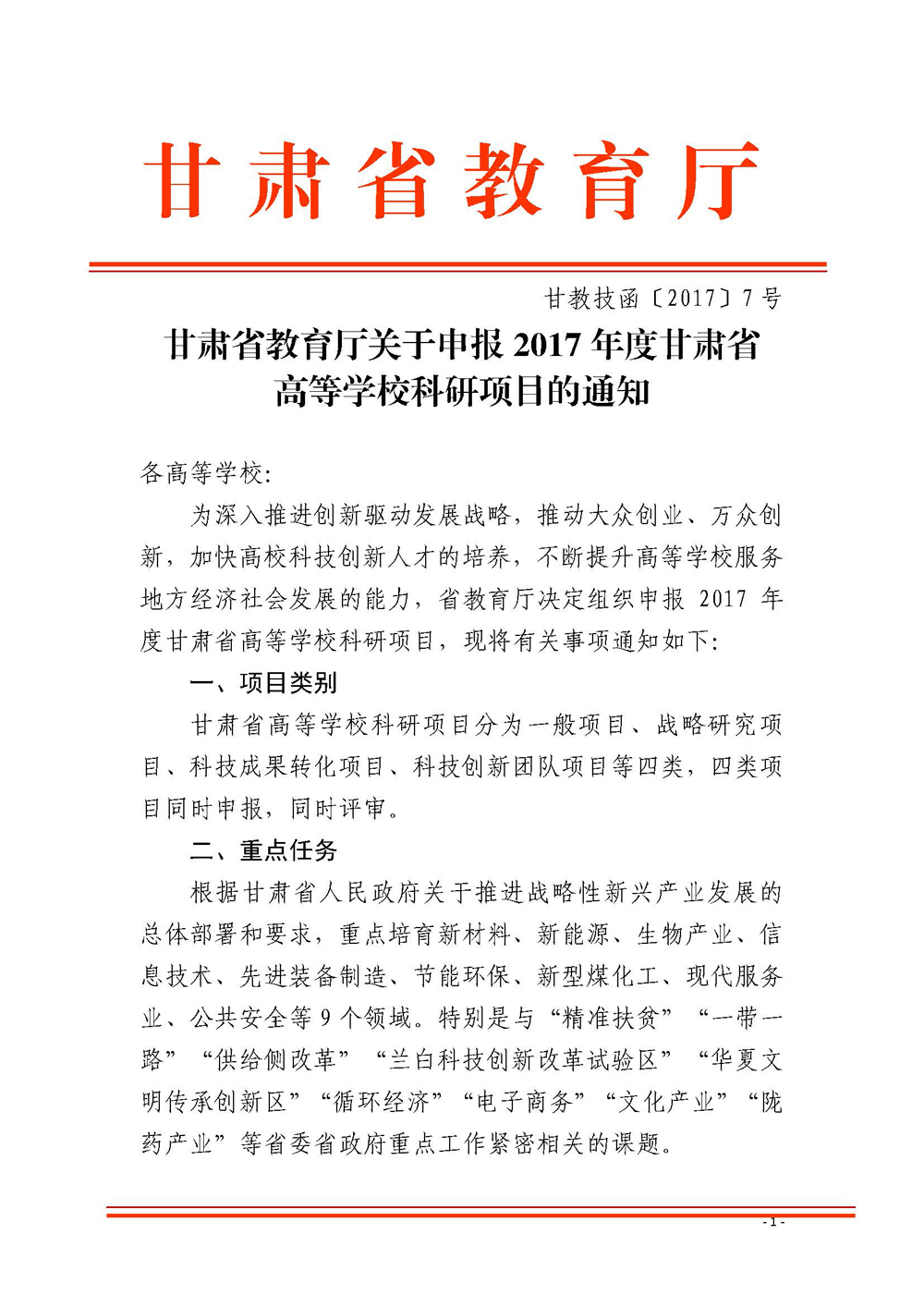 甘肅省教育廳關(guān)于申報(bào)2017年度甘肅省高等學(xué)??蒲许?xiàng)目的通知