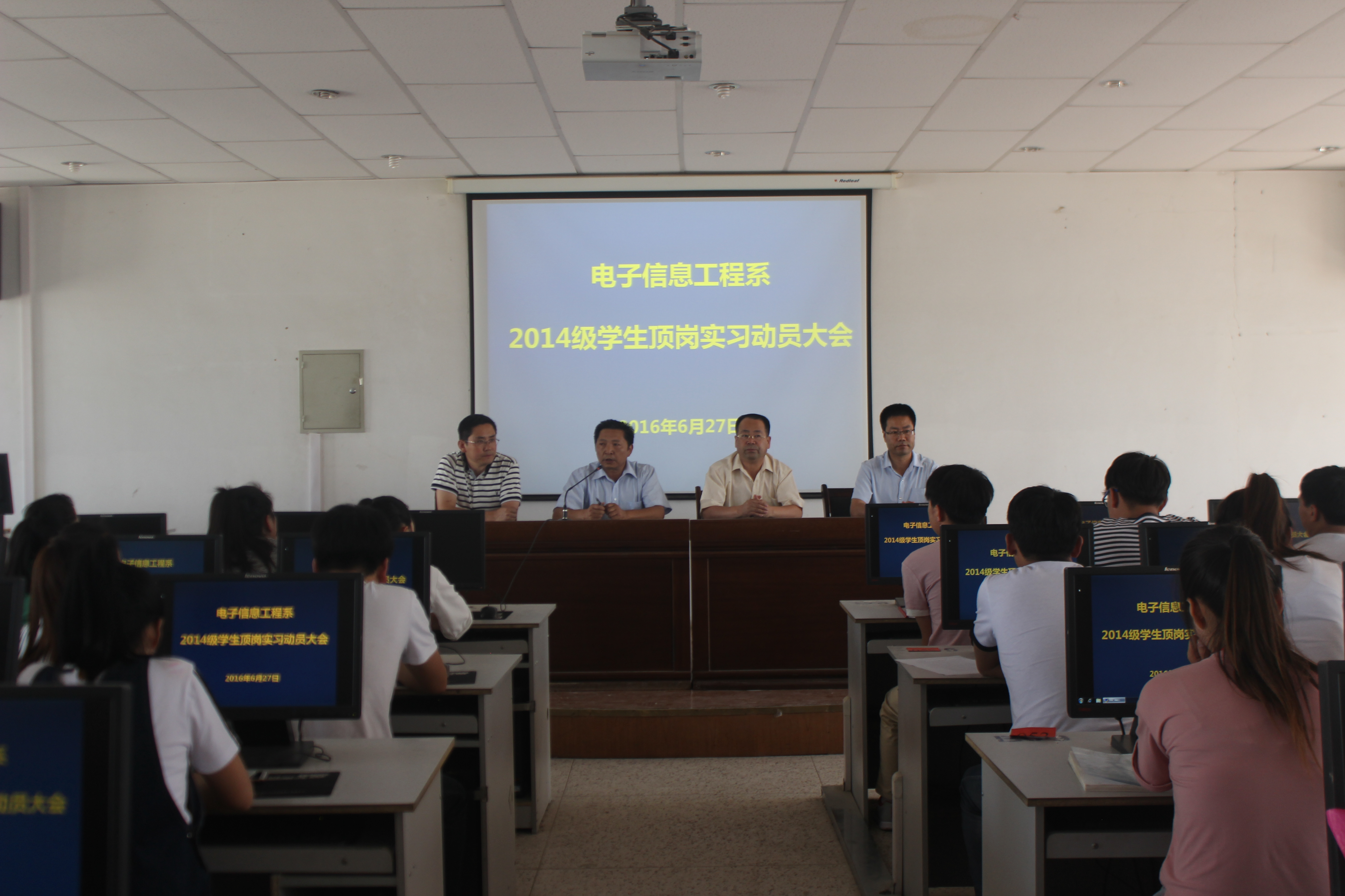 2016年6月27日下午3點(diǎn),電子信息工程系2014級(jí)學(xué)生頂崗實(shí)習(xí)動(dòng)員大會(huì)在尚德樓十一號(hào)機(jī)房舉行。系黨總支書記袁青年、系主任白玉珍、副書記張伯成,班主任鄧偉華、唐宗舜、孫麗山、陳平及2014級(jí)全體學(xué)生參加頂崗實(shí)習(xí)動(dòng)員大會(huì)。