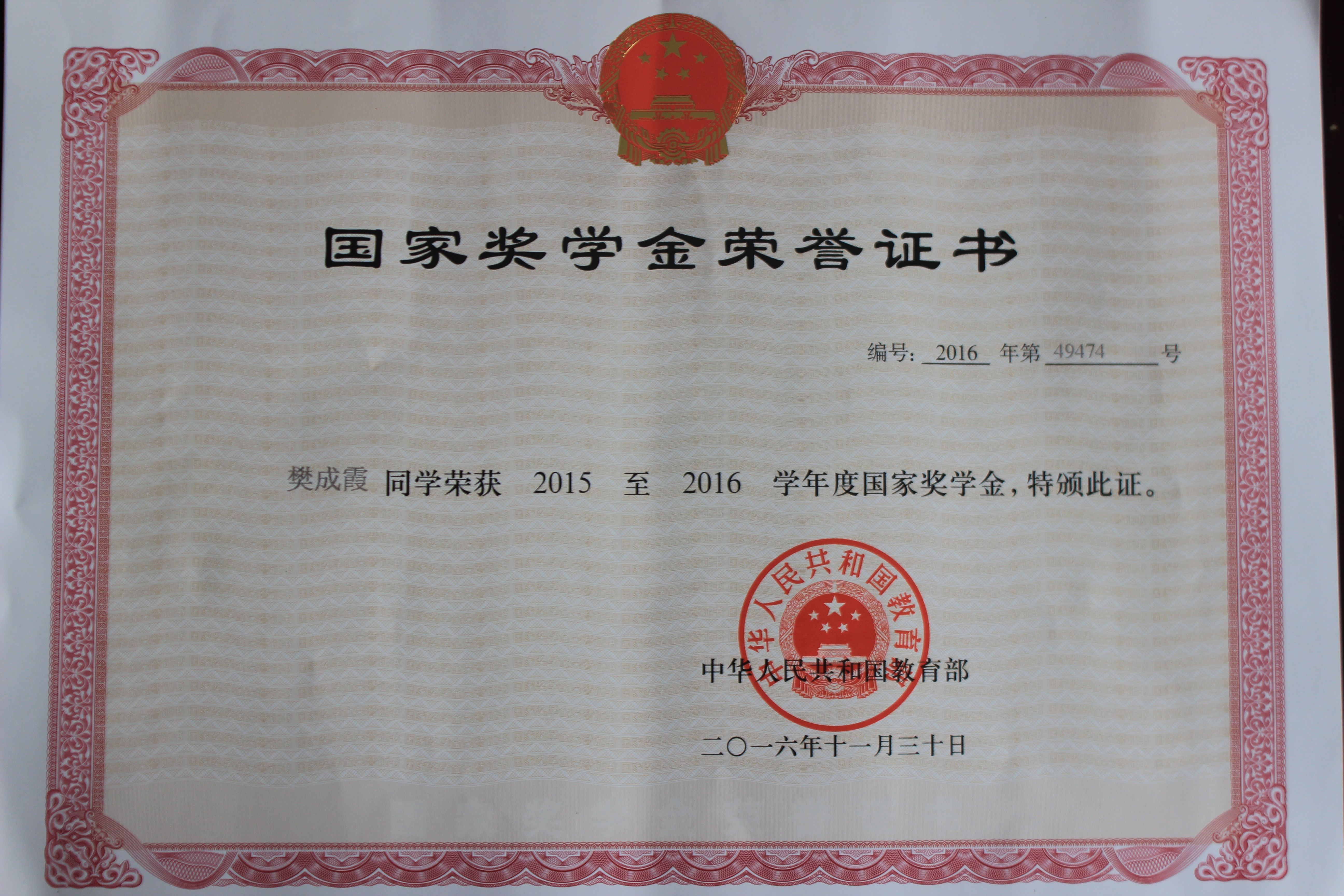 國家獎學金獲得者-樊成霞