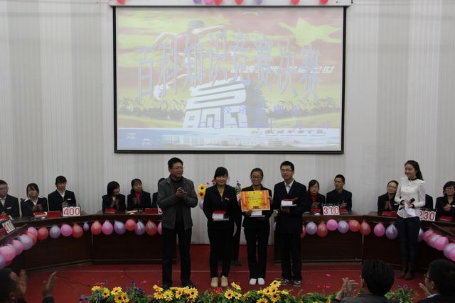 競賽結(jié)束后,王院長揭曉了本次比賽的全部獎項(xiàng),并對比賽中各代表隊(duì)的不俗表現(xiàn)給予了高度評價。他認(rèn)為經(jīng)濟(jì)管理系本次“百科知識競賽”集知識性與趣味性于一體,既豐富了學(xué)生的課余生活又拓寬了學(xué)生的知識面,在大學(xué)校園中非常必要,以后要多舉辦類似的活動。隨后,經(jīng)管系黨總支白書記作了總結(jié)講話,白書記首先對本次競賽取得圓滿成功表示祝賀,向在百忙之中抽出時間來參加活動的領(lǐng)導(dǎo)及老師表示衷心的感謝,并對本次組委會師生付出地辛勤勞動予以肯定!白書記希望,全體同學(xué)能以此次知識競賽活動為契機(jī),勤奮學(xué)習(xí)、苦練技能,奮力拼搏,成為優(yōu)秀的應(yīng)用性人才。