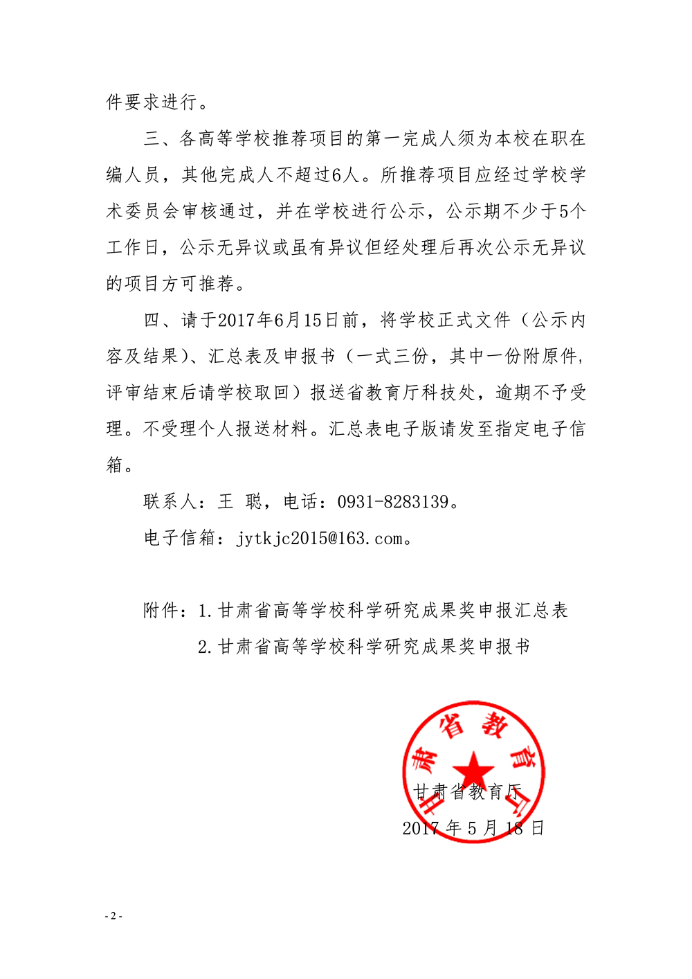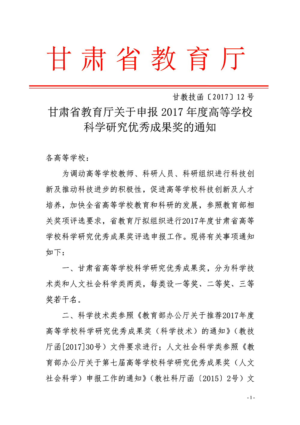 轉(zhuǎn)發(fā)甘肅省教育廳關于申報2017年度高等學??茖W研究優(yōu)秀成果獎的通知