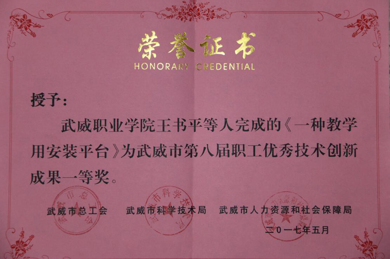為貫徹落實(shí)武威市委、市政府關(guān)于《武威市十萬職工職業(yè)技能素質(zhì)提升活動工作方案(2016-2020年)》(武政辦發(fā)〔2016〕72號)文件精神,推動我市“雙創(chuàng)”工作的深入開展,激發(fā)我市廣大企事業(yè)職工提升技能和開拓創(chuàng)新的熱情。近日,由市總工會、市人社局、市科技局等單位聯(lián)合舉辦了“武威市第八屆職工技術(shù)創(chuàng)新成果評選活動”。本屆職工技術(shù)創(chuàng)新成果評選共征集創(chuàng)新成果87項,其中:學(xué)院推薦了十項研究課題、專利技術(shù)項目,王書平團(tuán)隊《一種教學(xué)用安裝平臺》項目成果榮獲一等獎,申賓德團(tuán)隊《簡易焊工考試用帶坡口鋼板火焰切割下料機(jī)的研究與應(yīng)用》,王勝團(tuán)隊《“胰美舒”治療2型糖尿病周圍神經(jīng)病變(氣陰兩虛兼瘀證)的臨床觀察》項目成果榮獲三等獎。