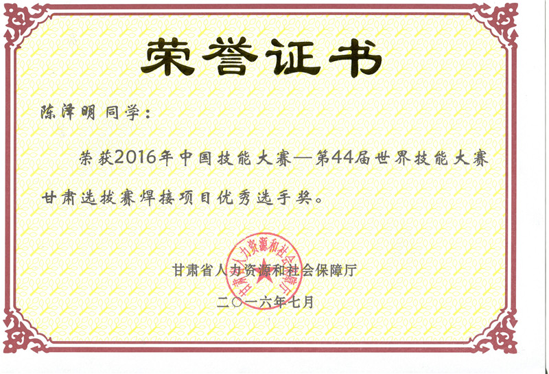 第44屆世界技能大賽甘肅選拔賽焊接項(xiàng)目優(yōu)秀獎(jiǎng)